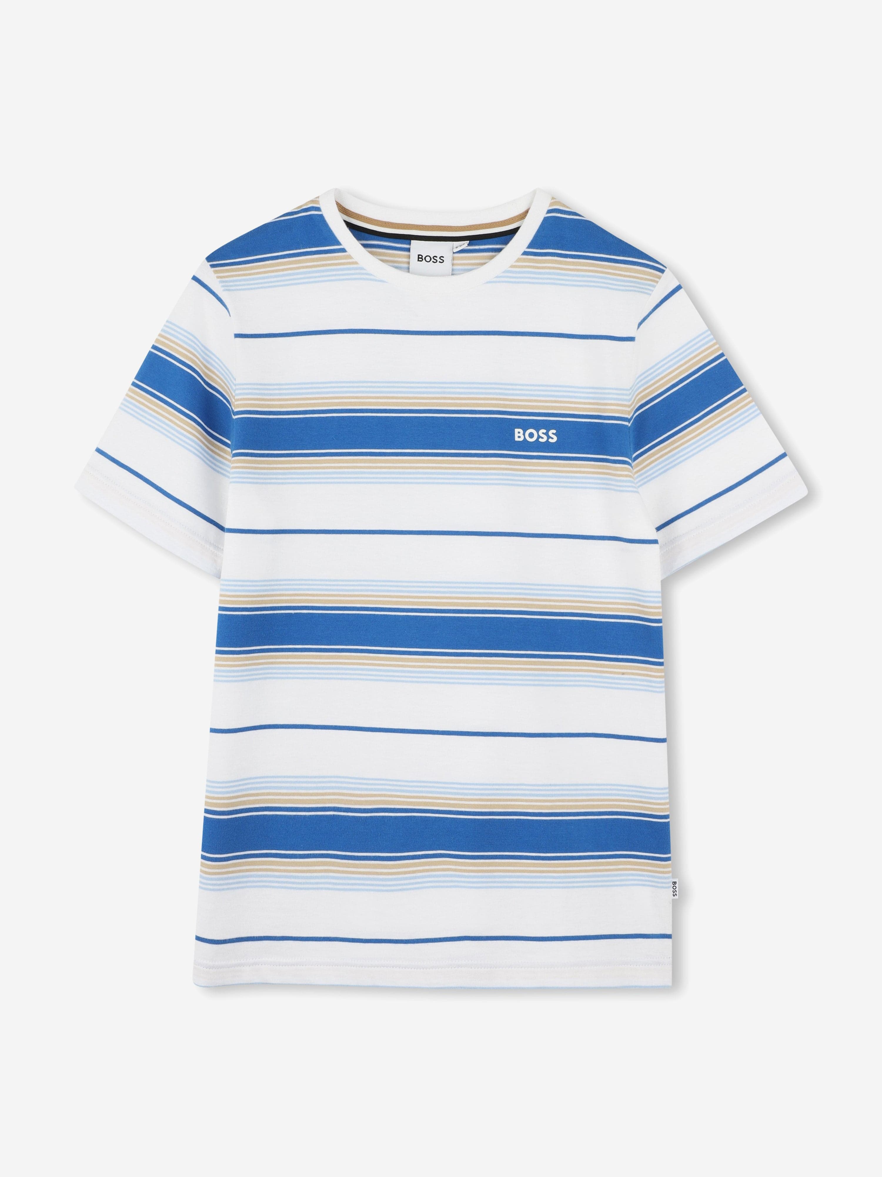 Elevate your young gentleman's style with the BOSS Boys Striped Logo T-Shirt in Blue – a sartorial staple for SS2025.......