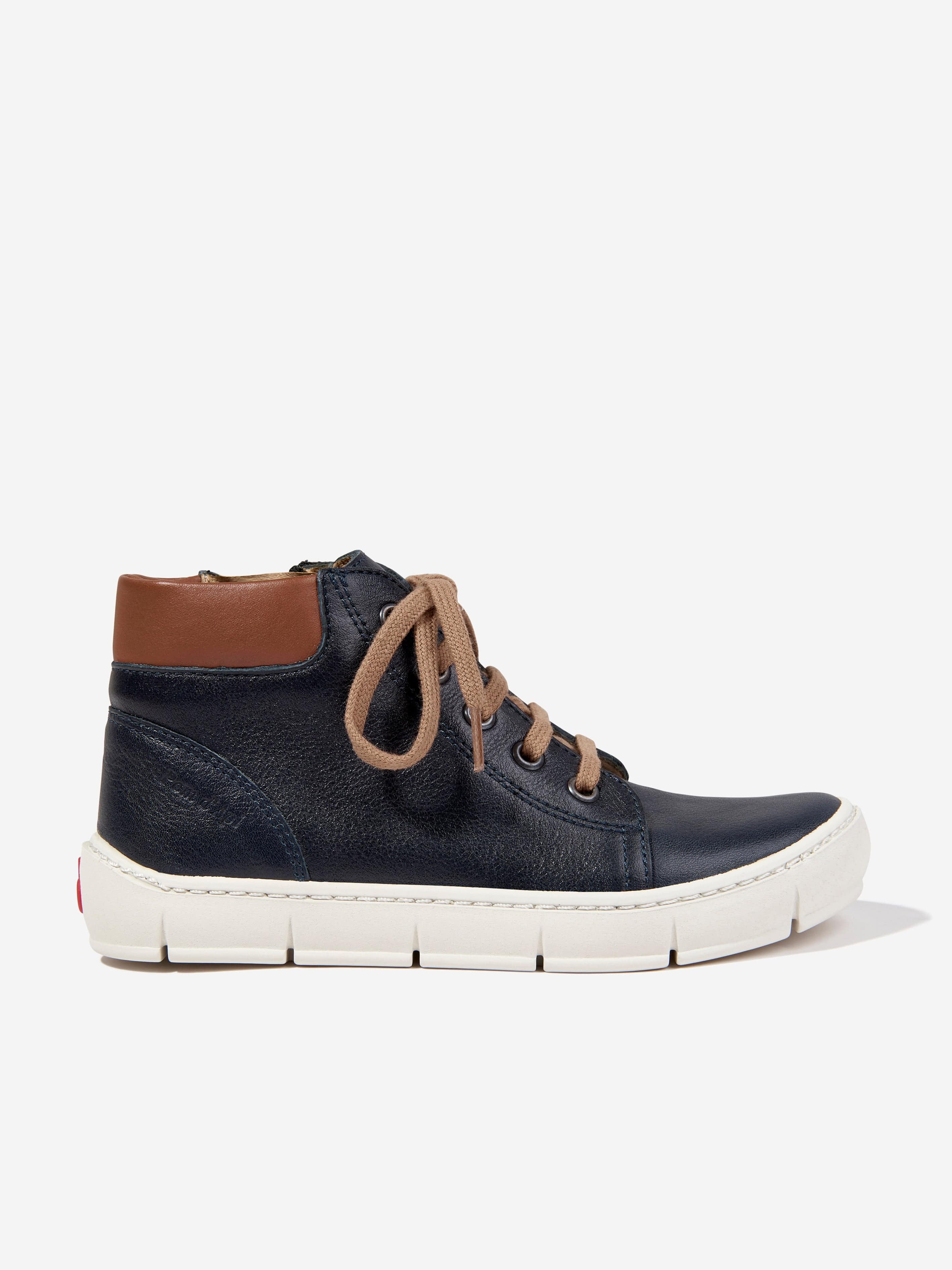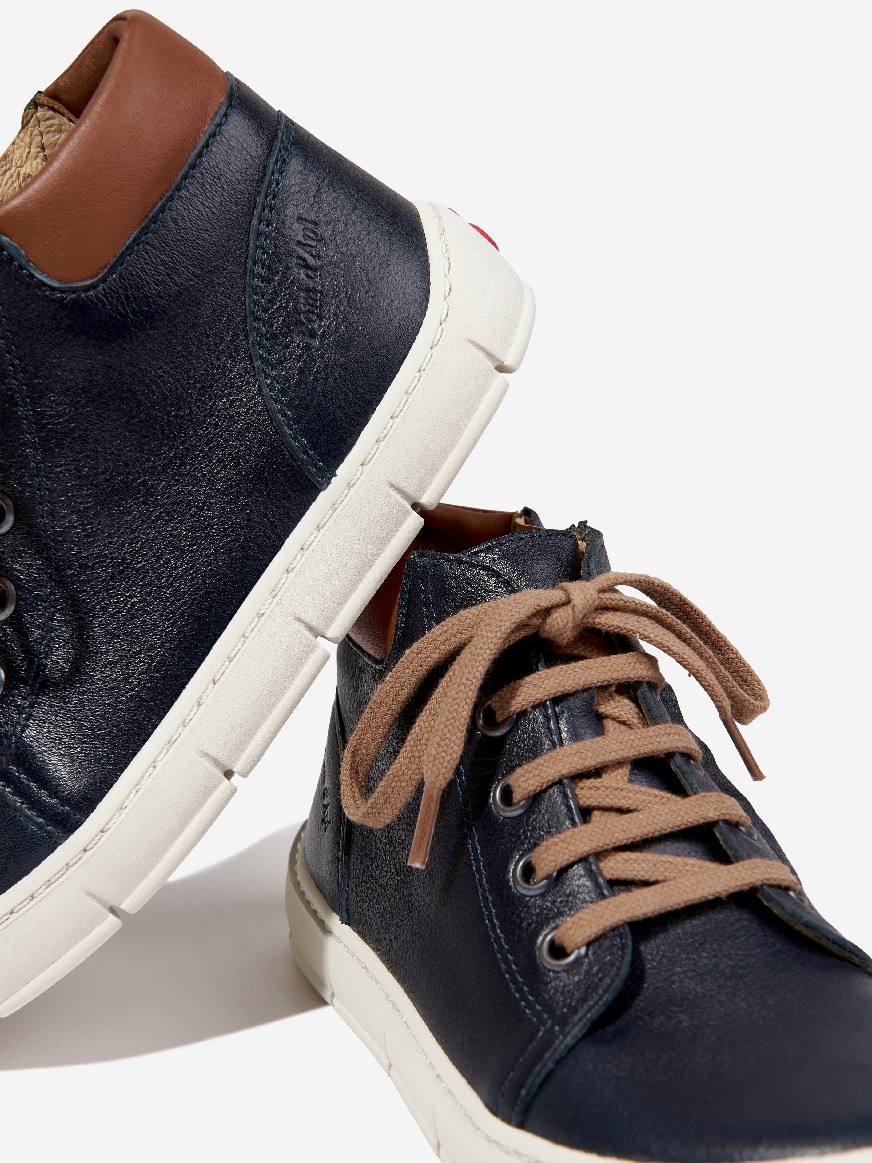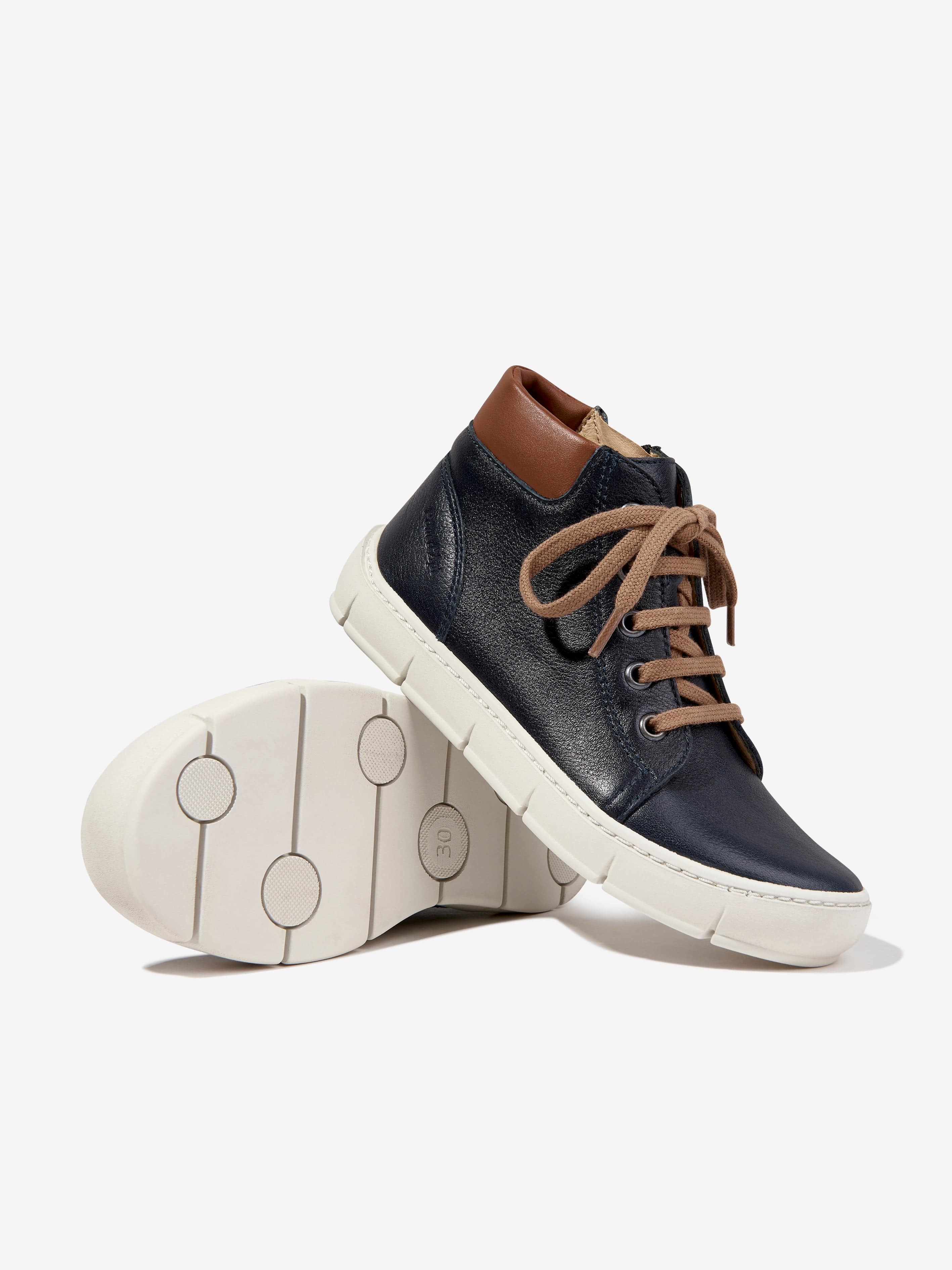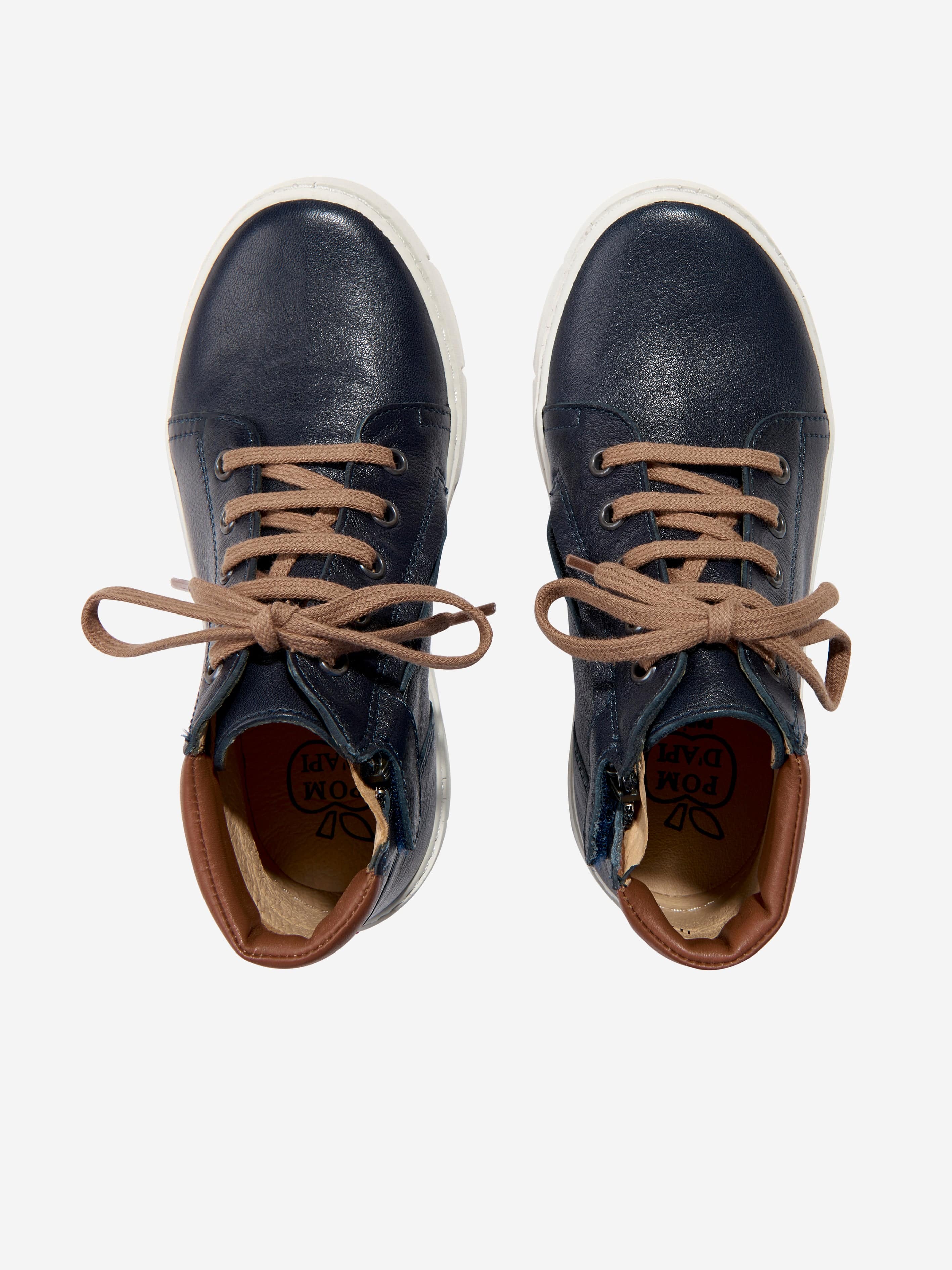 Introducing the Boys Leather High Top Trainers in Navy by pomd api – a quintessential addition to your young one's......