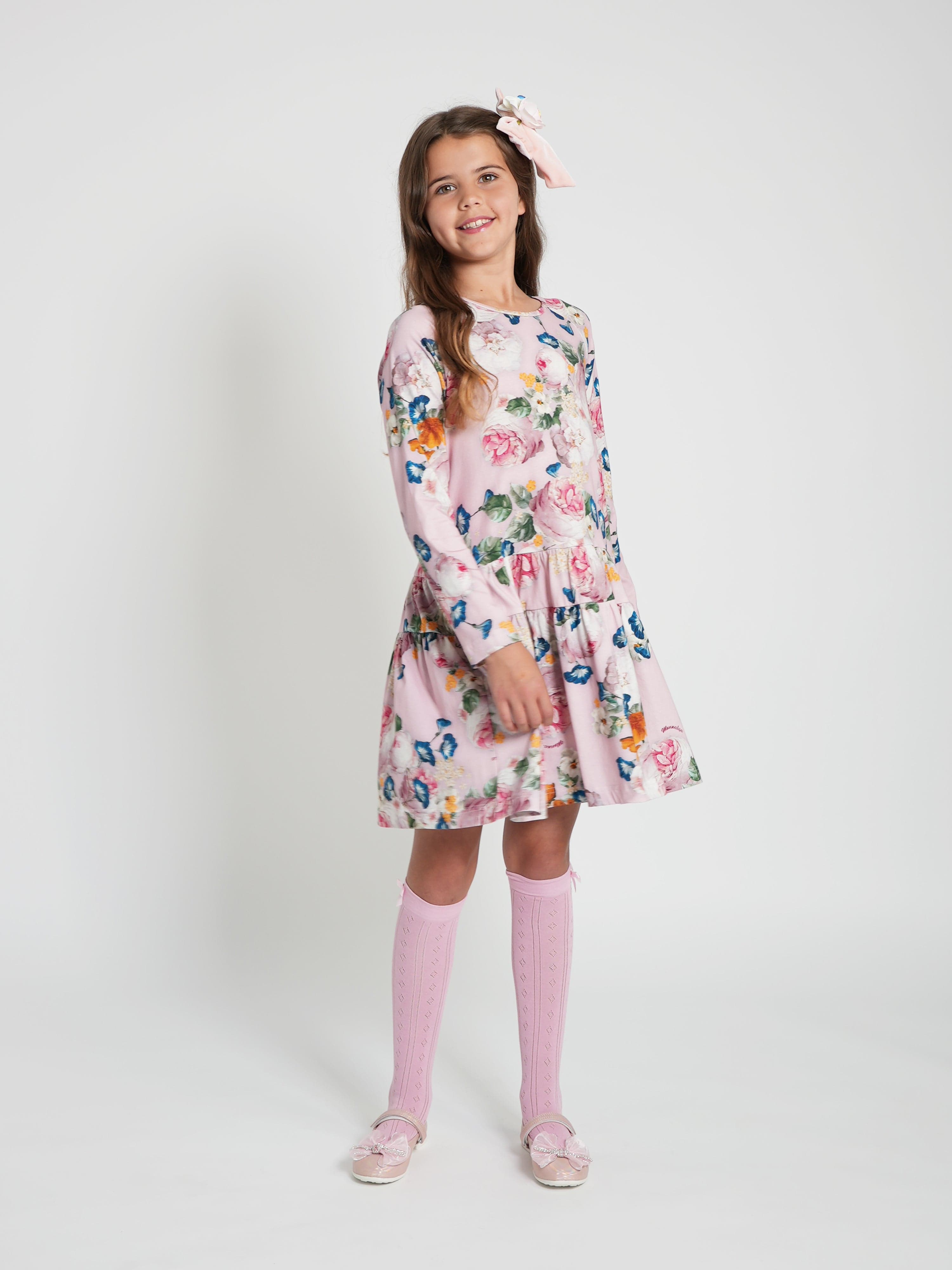 Introducing the chic and vibrant 'Girls Baroque Roses Jersey Dress in Multicolour' by Monnalisa - the epitome of Italian craftsmanship.......