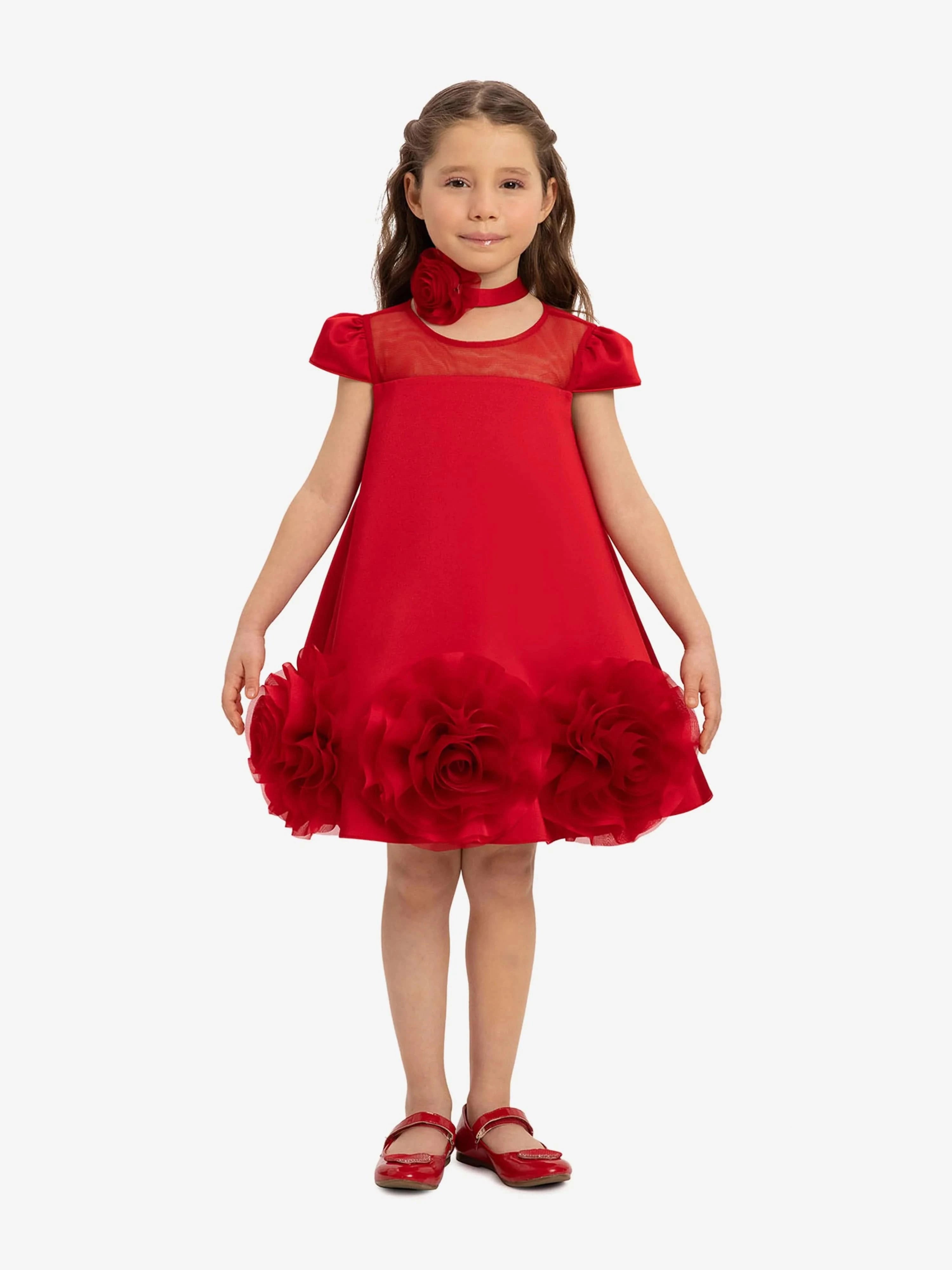 Dress & Fleur sport regal abstracts with an innovative twist. This girls red dress offers a luxurious feel and an elegant silhouette. Woven from a soft satin fabric, it has a mesh yoke and large 3D flower appliqués at the hem.