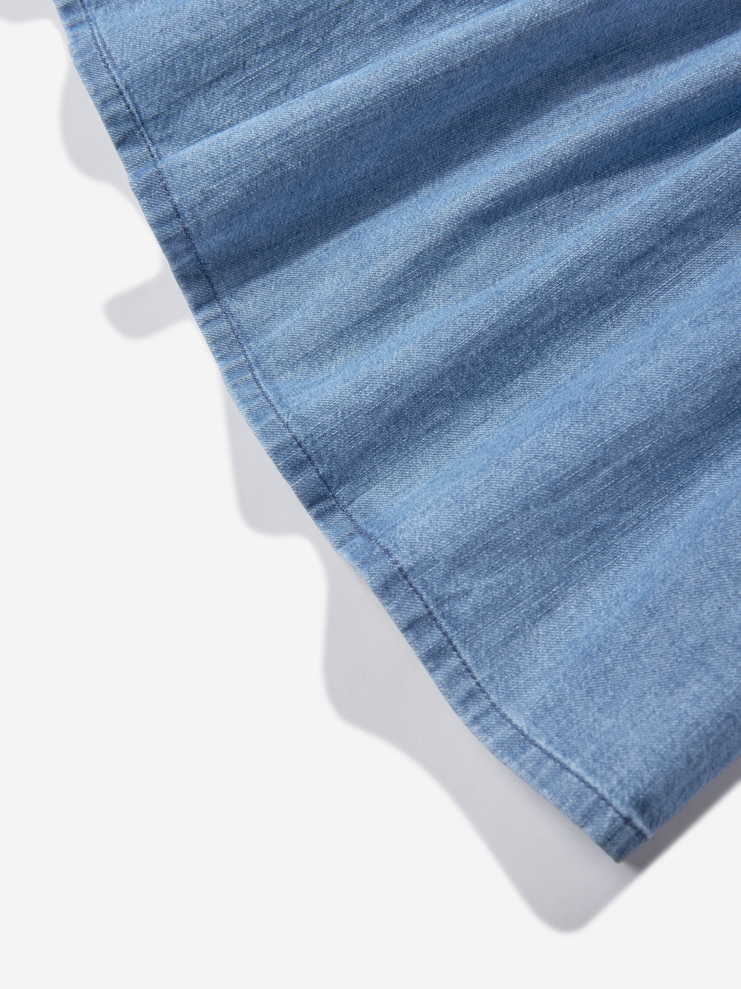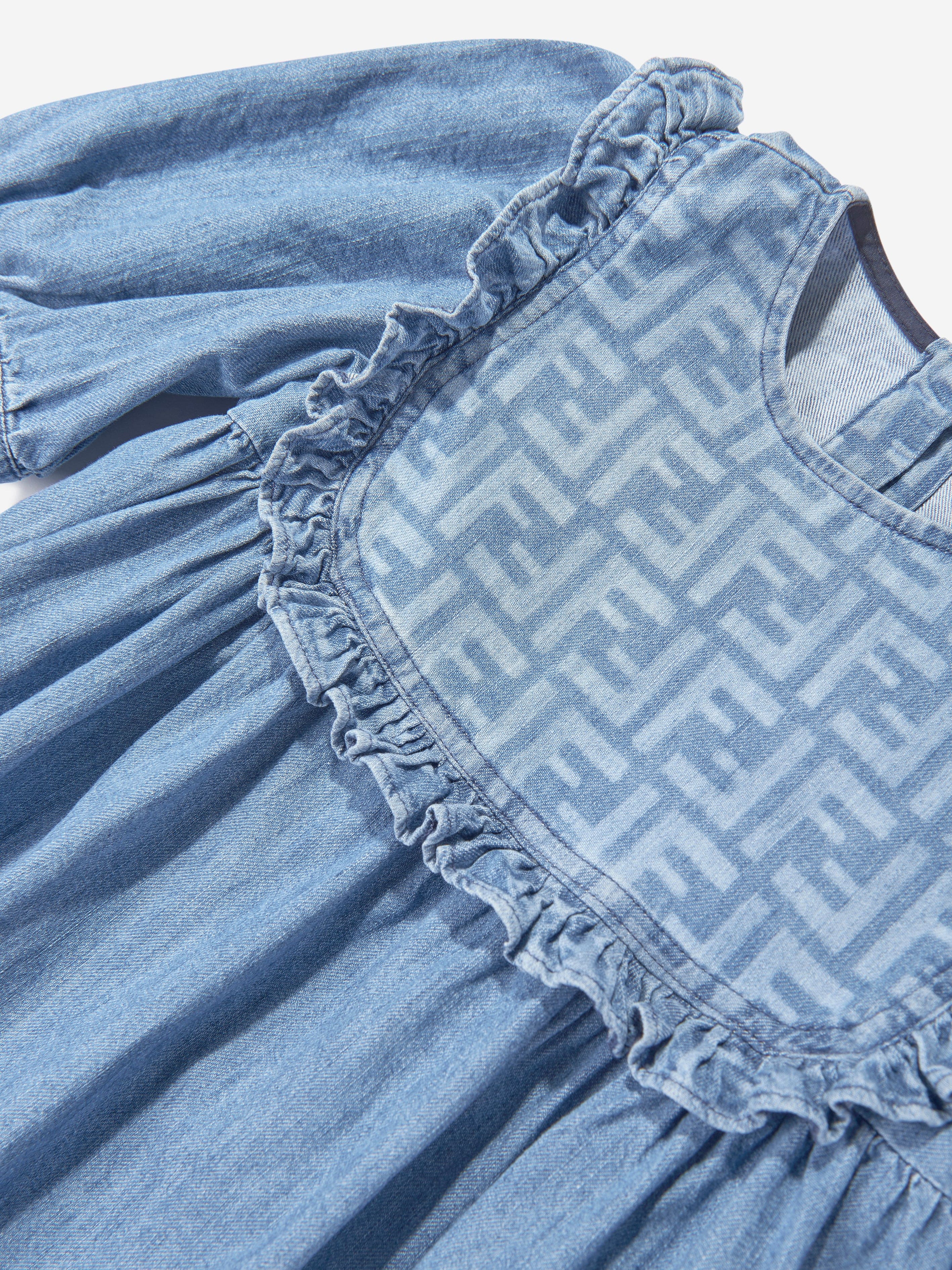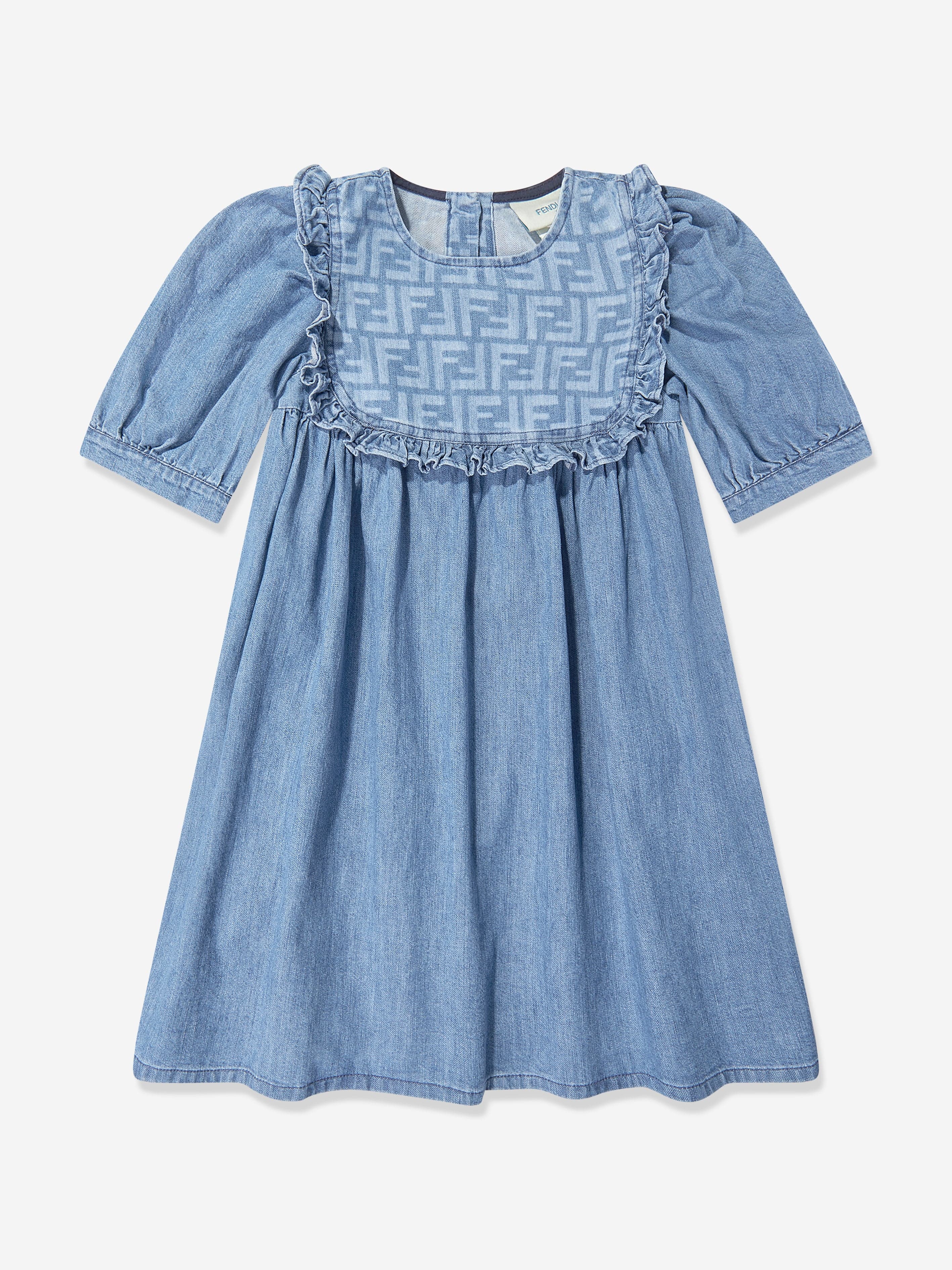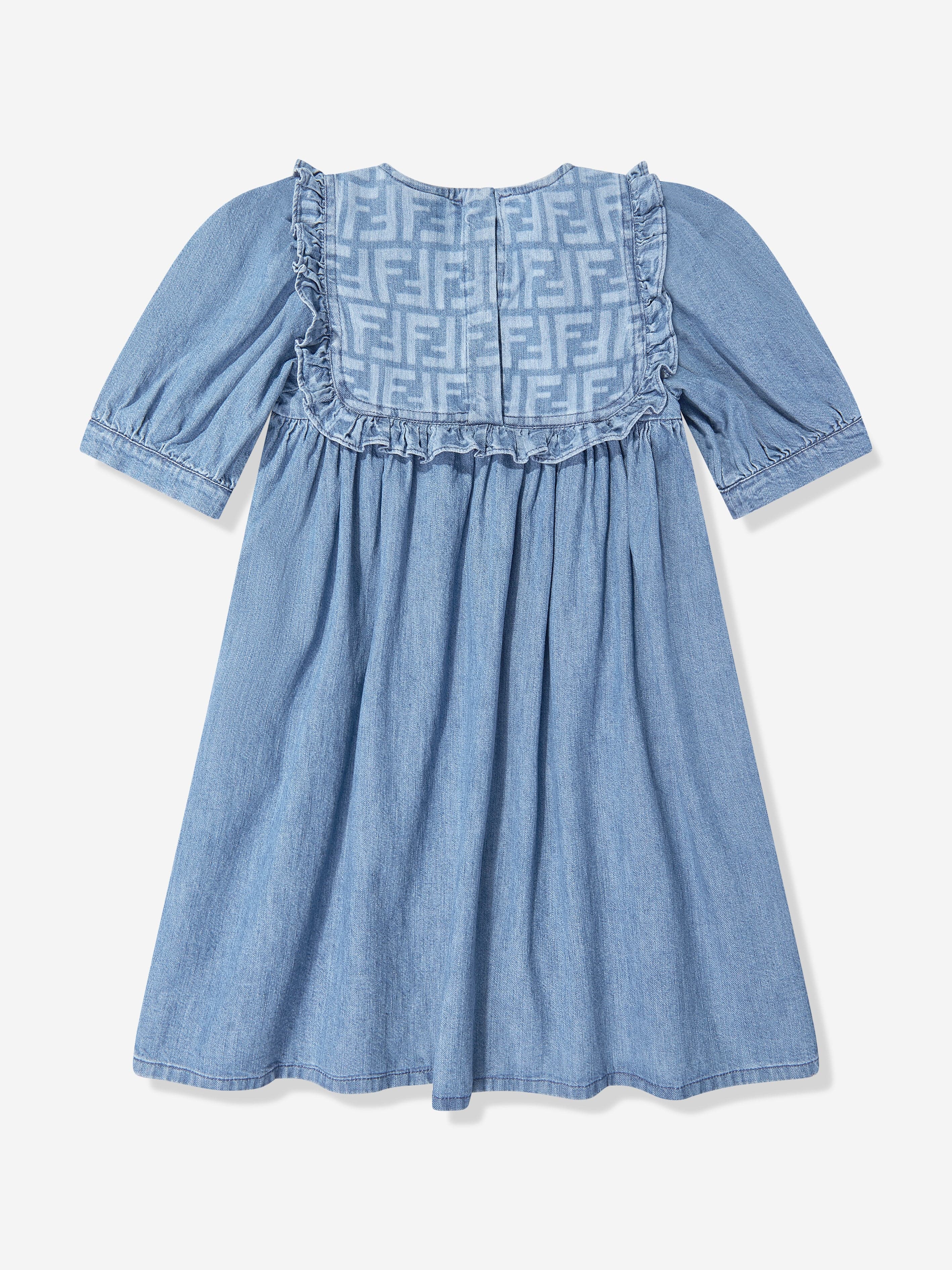 Delight in the chic elegance of the Girls FF Light Denim Dress in Blue by Fendi Kids, a quintessential piece......