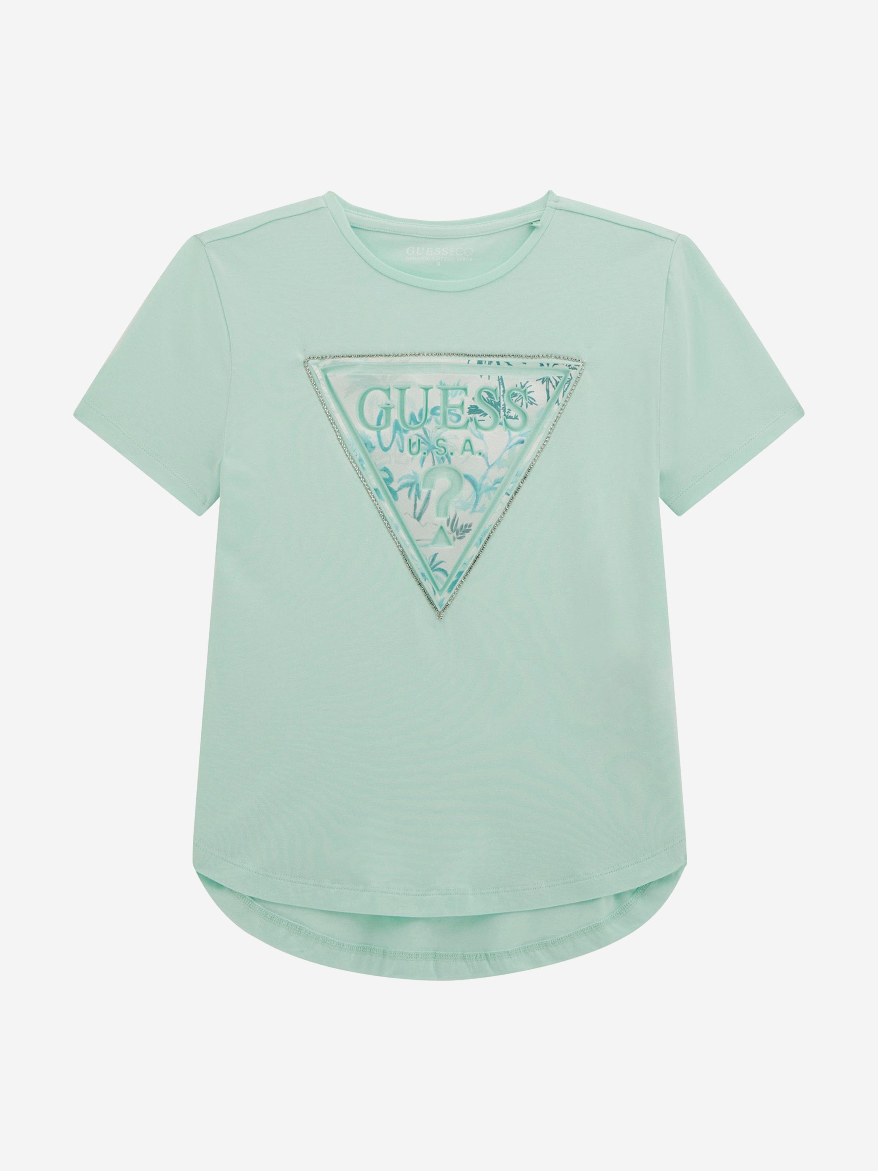 Introducing the exquisite Girls High Low T-Shirt in Green by Guess, a sophisticated addition to your young lady's SS2025 wardrobe.......