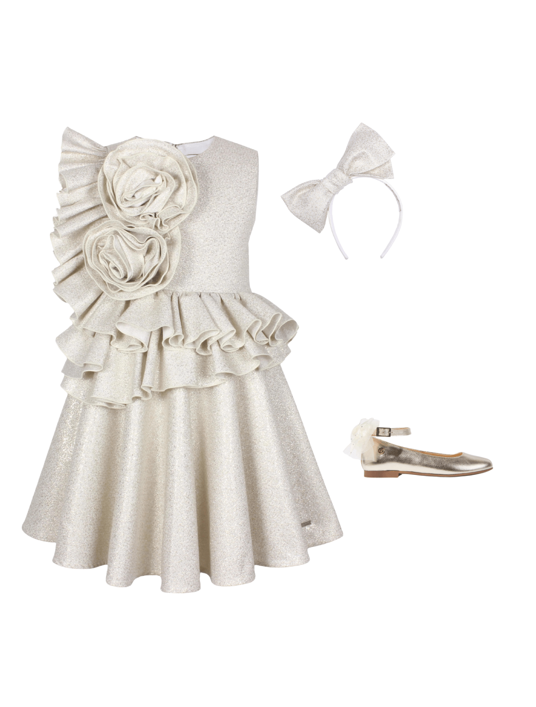 Introducing the exquisite Girls In Bloom Ruffle Flower Dress in Gold by Jessie and James, tailor-made for the spring-summer season......
