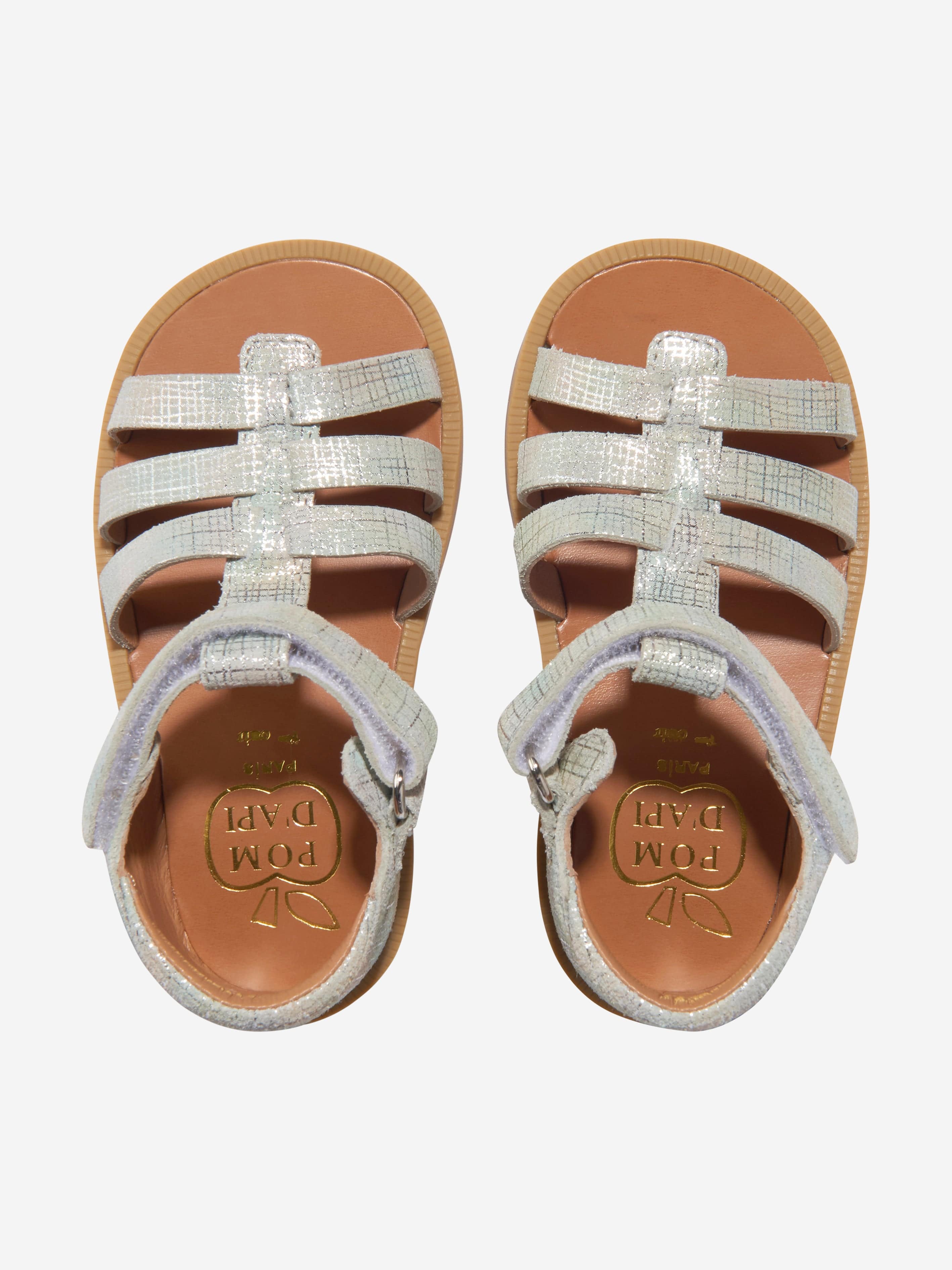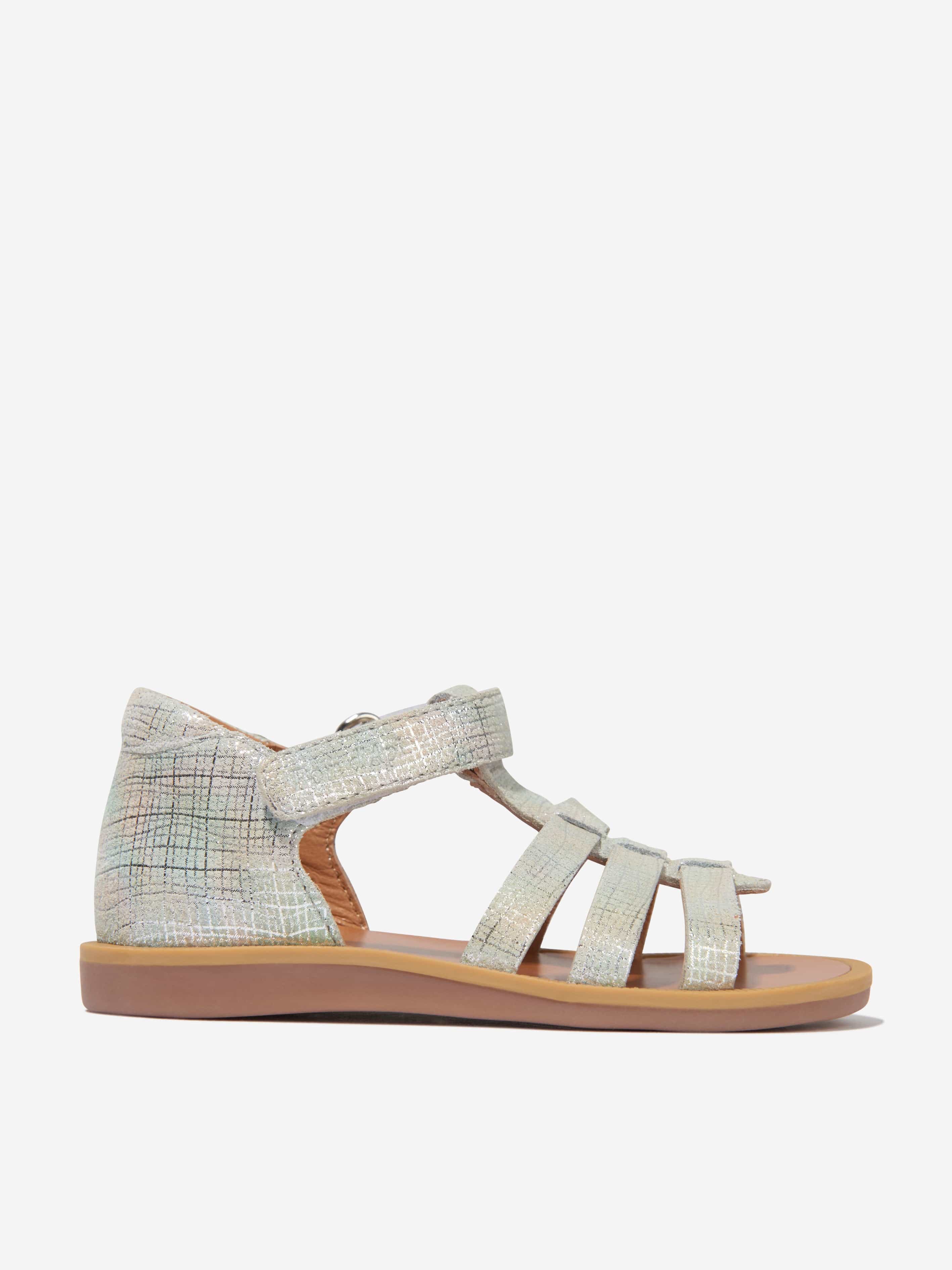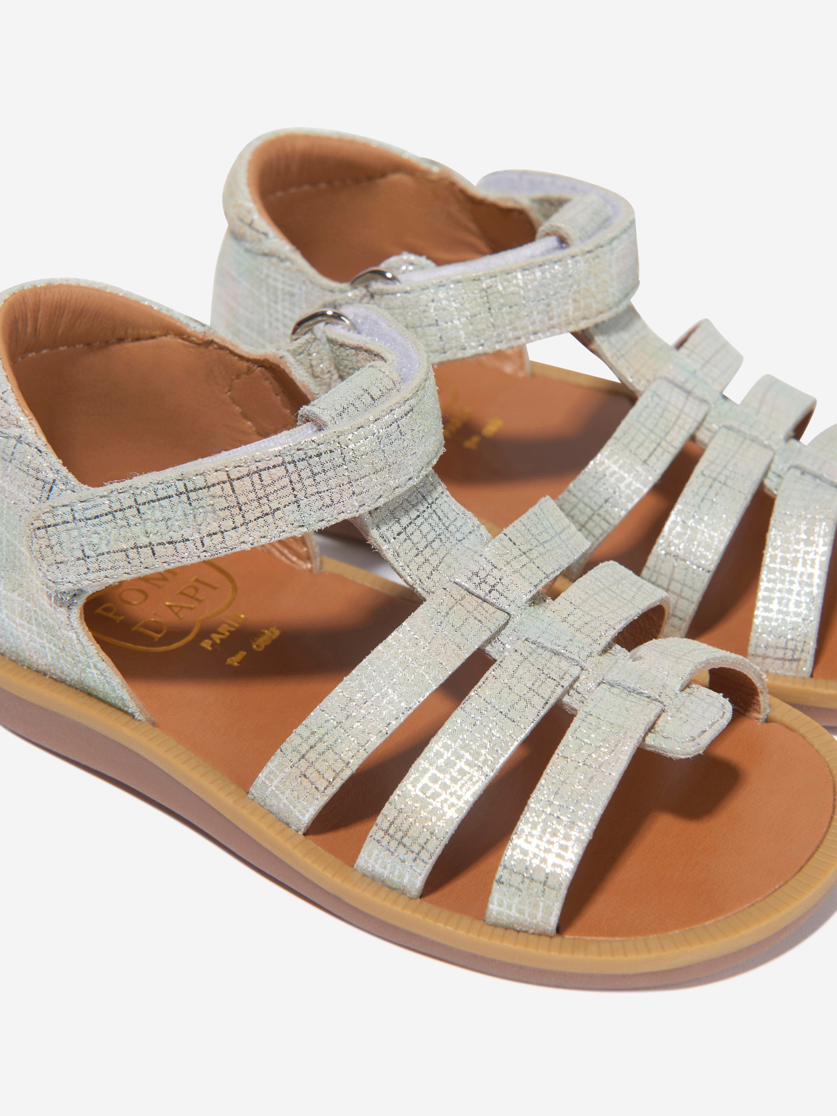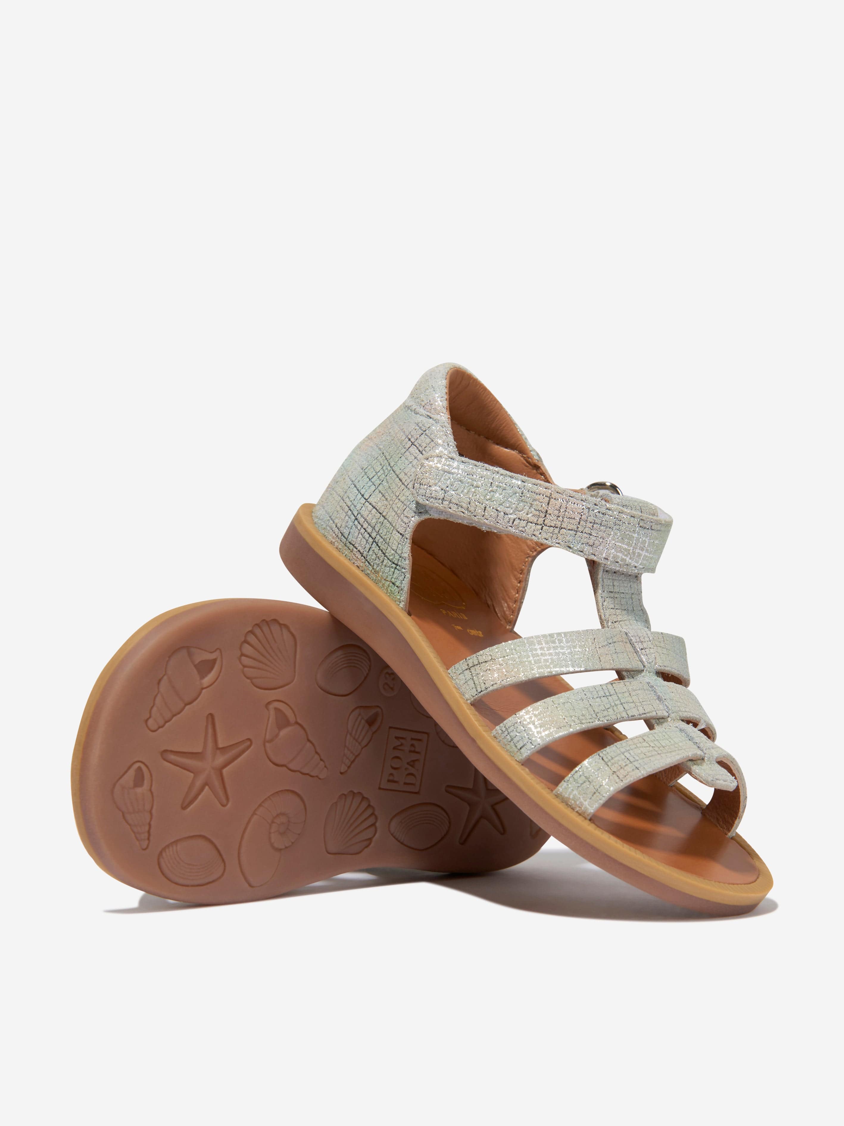 Introducing the chic Girls Leather Poppy Strap Sandals in Silver by pomd api, the quintessential addition to any young fashionista's......