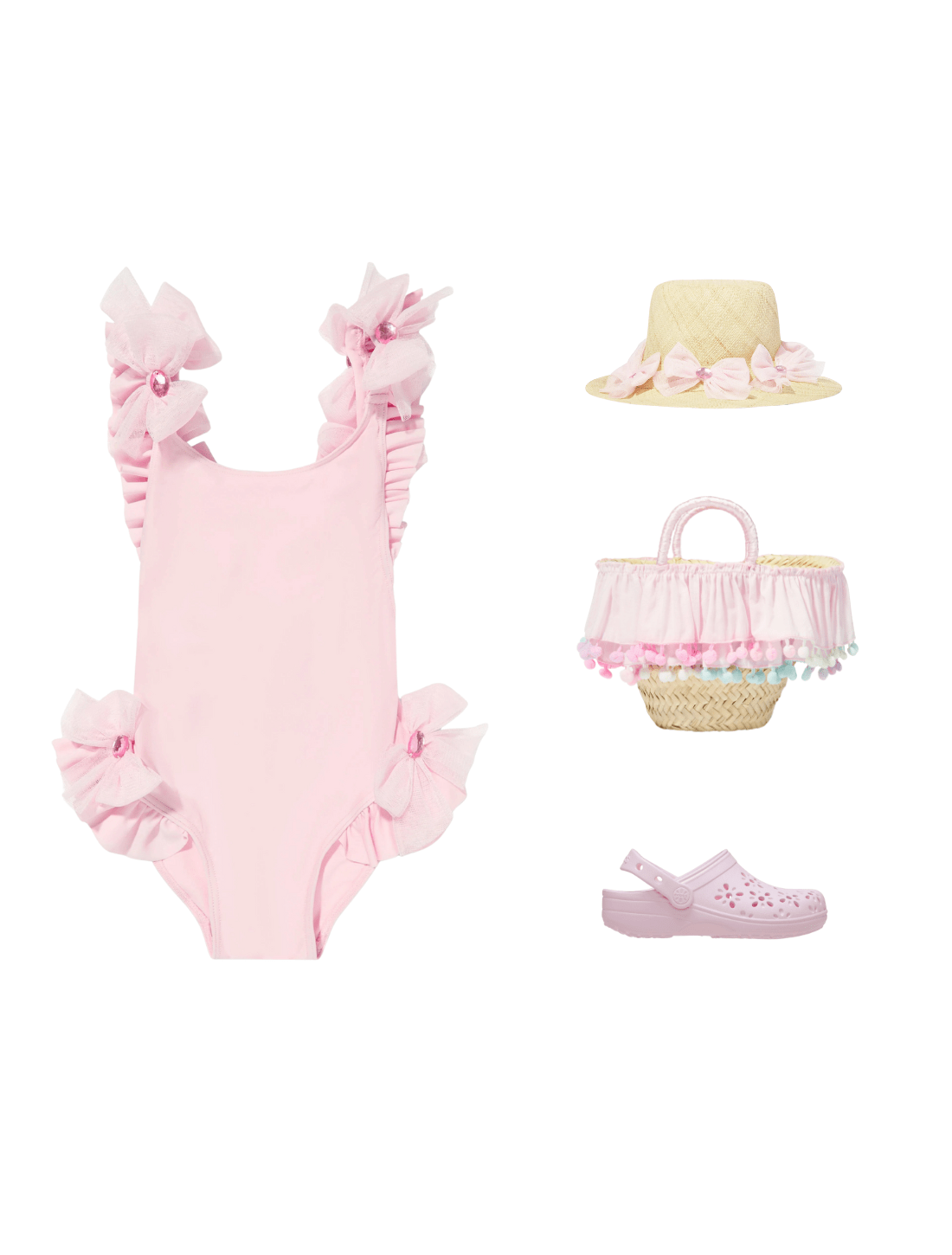 Selini Action project mesmeric detailing and craftsmanship into their unparalleled aesthetics. This girls tulle bows diamante swimsuit in pink has......